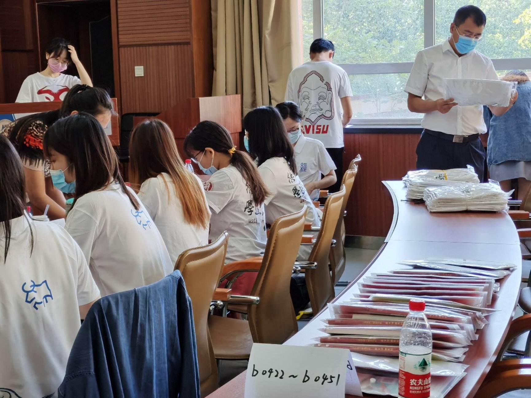 在本部校区,二十余名志愿者在培训后来到经管楼,为新生们的到来布置场地、连接设备。口罩挡不住大家的笑脸,重复的话语磨不灭志愿者们的热情。“人脸识别、提交材料、领取材料、领取银行卡、办理保险、领取院服、填写个人信息表……”整套流程背后是反复的思量、是人性化的一条龙式设计。