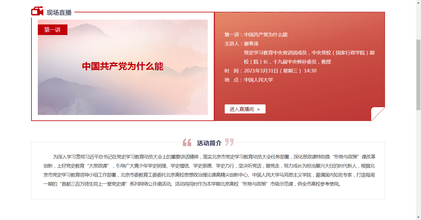 为深入学习贯彻习近平总书记在党史学习教育动员大会上的重要讲话精神,引导广大师生做到学史明理、学史增信、学史崇德、学史力行,增强“四个意识”、坚定“四个自信”、做到“两个维护”,不断提高政治判断力、政治领悟力、政治执行力。3月31日下午,由北京市委教育工委、北京高校思想政治理论课高精尖创新中心打造的“首都百万师生同上一堂党史课”网络公开课启动仪式暨首场报告会在中国人民大学举行。中央党校(国家行政学院)副校(院)长谢春涛教授应邀担任首讲嘉宾,聚焦“中国共产党为什么能建立新中国”“为什么能收拾好国民党的烂摊子”等重点问题,系统总结了中国共产党“有远大理想追求”“有科学理论引领”“有选贤任能机制”“有严明纪律规矩”“有自我革命精神”“有强大领导能力”等六个方面优秀特质,科学解答了“中国共产党为什么能”这一重大课题。按照公司党委教师工作部要求,学院组织各系全体无课的教师通过网络直播方式参与线上聆听学习,积极报送学习感想,反响热烈。