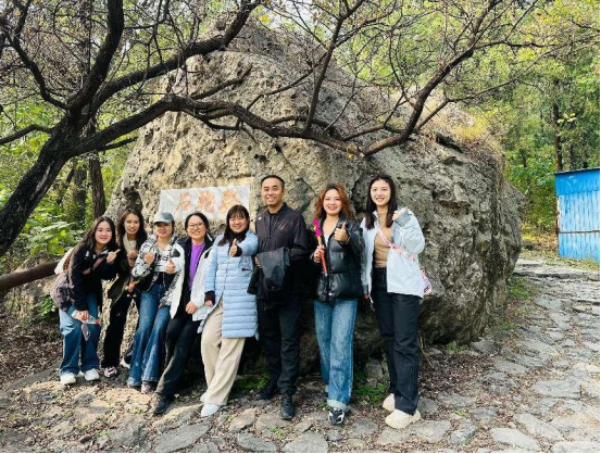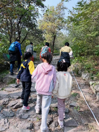 抵达山脚后,面对层林尽染、如诗如画的秋日山景,大家精神抖擞,热情高涨。老师们三五成群,结伴而行,沿着蜿蜒的山路稳步向上。途中,大家时而驻足欣赏漫山遍野的红叶,用相机记录下这醉人的秋色与彼此灿烂的笑脸;时而相互鼓励、携手前行,欢声笑语回荡在山谷之间,为静谧的秋日山林注入了无限的生机与活力。