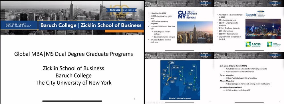 Rong Yan首先介绍了杰克林商学院的基本情况、并对国际合作双学位项目概况和申请要求等几方面进行了说明。随后,Korn教授讲解了此次项目的课程设置、研究生职业管理中心和毕业生的就业去向,同时强调该巴鲁克分校临近华尔街,可为员工提供良好的实习、就业机会。