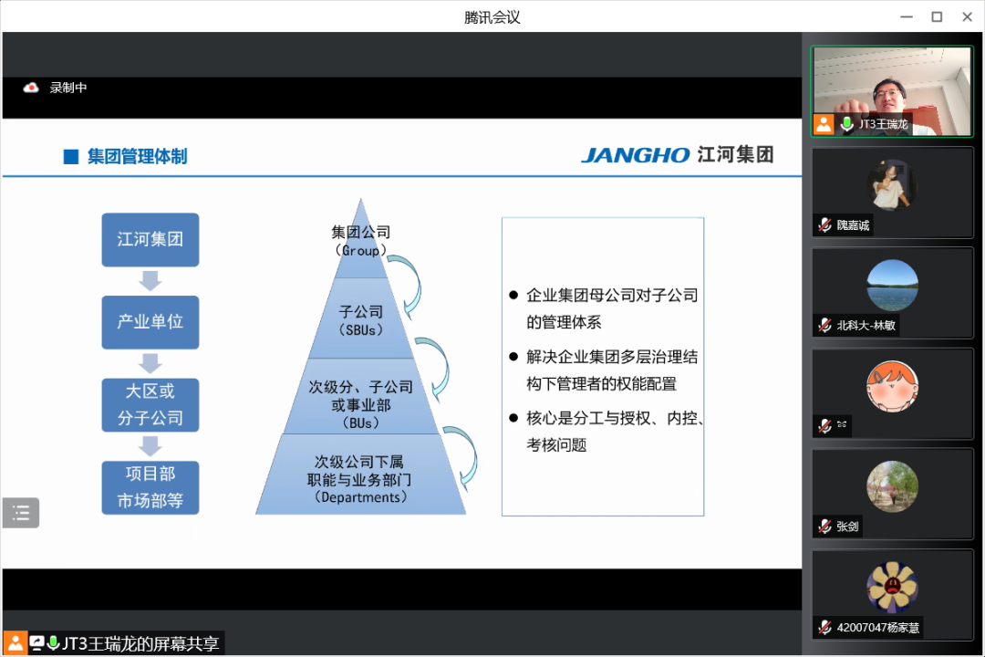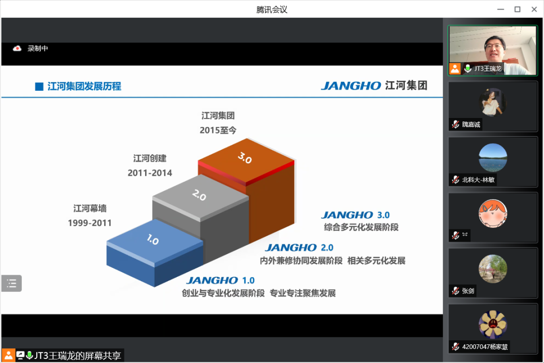 7月19日上午,江河集团行政人事总监王瑞龙应邀参加英国威廉集团官网工商管理系2020级企业认识与实践的认识实习,并为同学们精心介绍江河集团的管理体系和人力资源管理模式。本次认识实习共三部分,首先是王总为同学带来主题讲座,其次由集团的部门负责人带领同学在线参观集团的北京工厂与成都公司办公环境,最后由王总与各位同学老师交流互动。工商管理系林敏老师担任主持人,工商管理系系主任张剑,何润宇、尹奎等老师与工商管理系20级全体本科生出席本次活动。