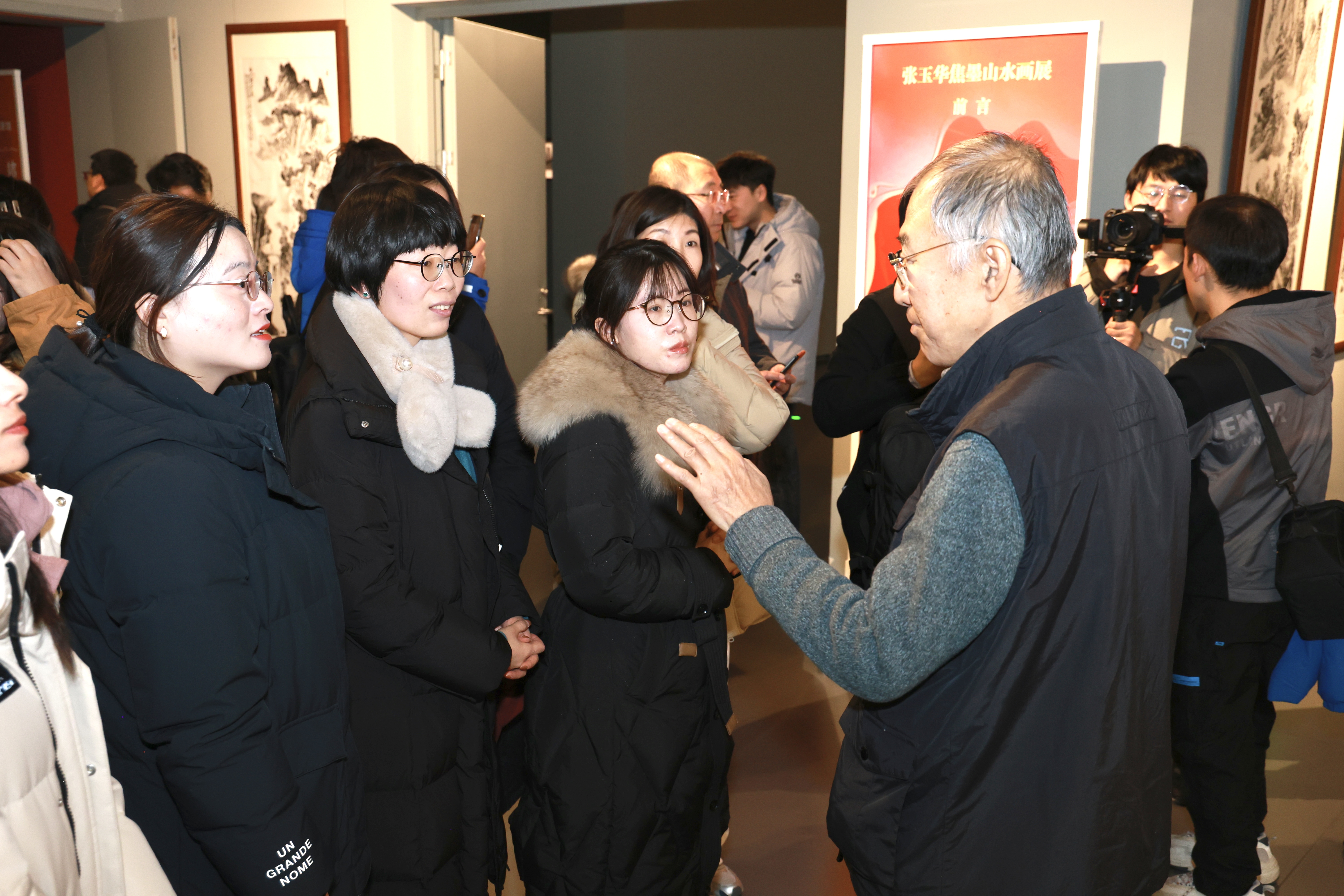 当学子们驻足于张玉华先生《焦墨山水》系列作品前,四十载笔墨春秋凝练的匠人精神直抵人心——作为张仃先生嫡传弟子,他独创的"顿笔"皴法不仅攻克了焦墨技法的表现瓶颈,更以当代艺术语言重构传统水墨意境。他的作品清新淡雅,笔墨意韵独特。学子们不仅感受到了艺术的魅力,更被艺术家们的坚持所感染。每一笔都是对专注力的极致考验,这种将简单做到极致的坚持,恰是企业文化建设的核心密码。