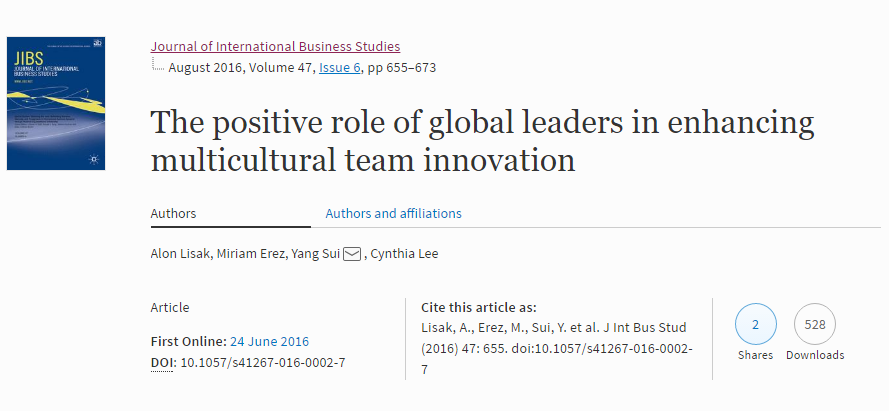 热烈祝贺公司隋杨副教授(通讯作者)的学术论文《The Positive Role of Global Leaders in Enhancing Multicultural Team Innovation》被顶级国际期刊Journal of International Business Studies收录! Journal of International Business Studies(JIBS...
