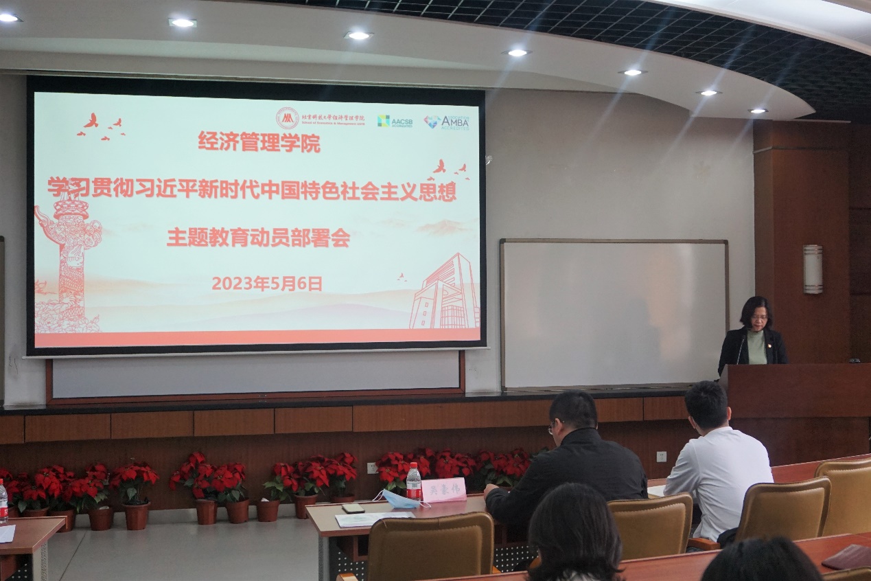 武森从开展主题教育的重大意义、目标要求和工作安排等三个方面介绍了学院开展主题教育的工作方案,并作动员部署。她强调,全院师生员工要深刻认识开展学习贯彻习近平新时代中国特色社会主义思想主题教育的重大政治引领意义、理论武装意义、实践推动意义、使命感召意义,切实把思想和行动统一到党中央决策部署上来,不折不扣抓好贯彻落实,以高度的政治自觉、饱满的政治热情、严肃的政治态度,积极投身主题教育,确保取得实效。她指出,全院师生要切实提高政治站位,认真落实中央统一部署和《中共教育部党组关于教育部直属高校深入开展学习贯彻习近平新时代中国特色社会主义思想主题教育的指导意见》要求,把“规定动作”做到位,同推动学院中心工作紧密结合,确保主题教育目标要求得到实现。同时充分发挥“两优一先”先进典型和本科低年级党支部入选2022年“全国党建工作样板党支部”培养创建以及管理科学与工程系党支部获批2022年学校首批“一融双高”样板党支部等的示范带动作用,将开展主题教育中激发出的信念信心、热情激情转化为攻坚克难、干事创业的具体行动,为把学院建设成为具有行业特色的一流经管学院而尽最大努力,为早日实现建成有特色的一流大学“北科梦”而奋勇前进,为全面建设社会主义现代化国家、实现中华民族伟大复兴中国梦贡献北科经管力量。